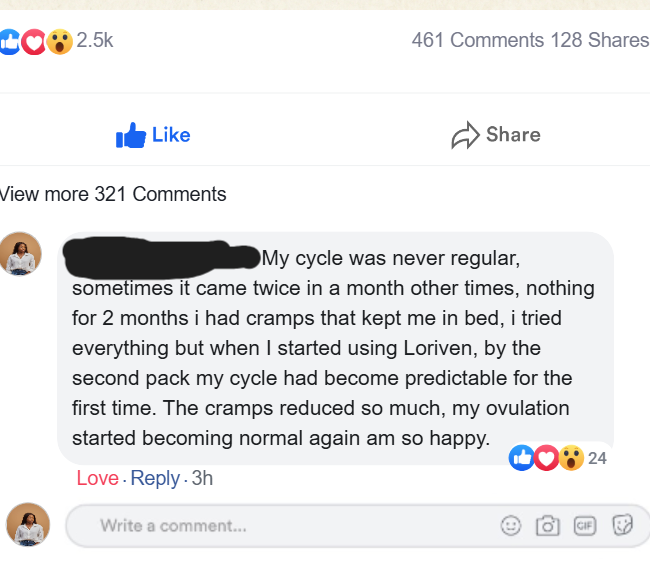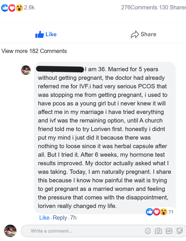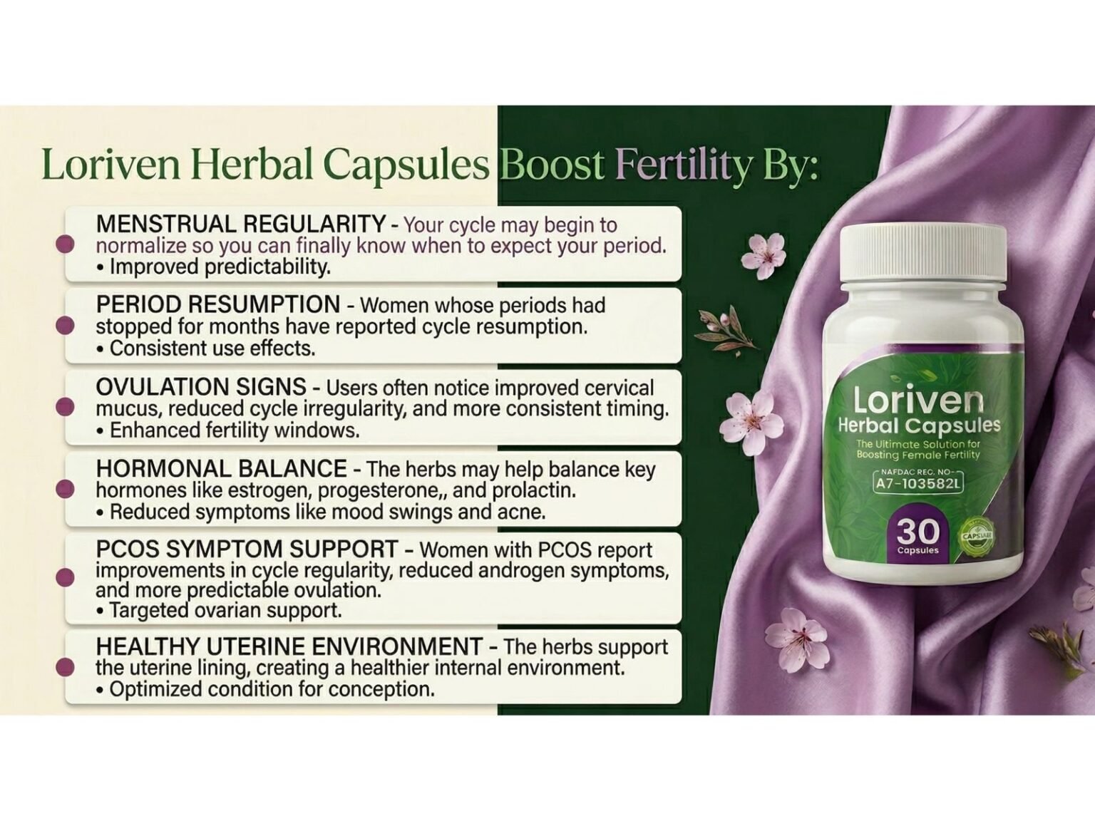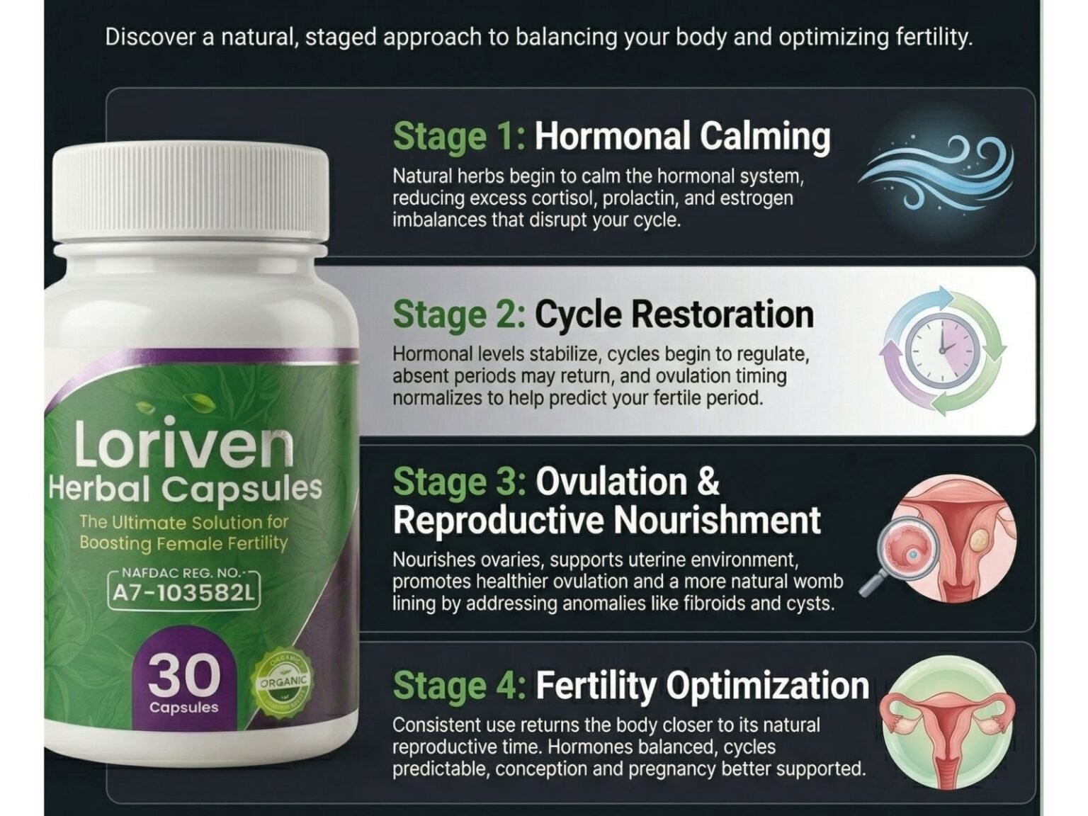 We are confident in the effectiveness of Loriven Herbal Capsule. It is 100% plant-based, contains no harsh chemicals, and is formulated specifically to support female hormonal, reproductive health and boost fertility. When used consistently as directed, most users experience meaningful positive changes within 8 weeks..